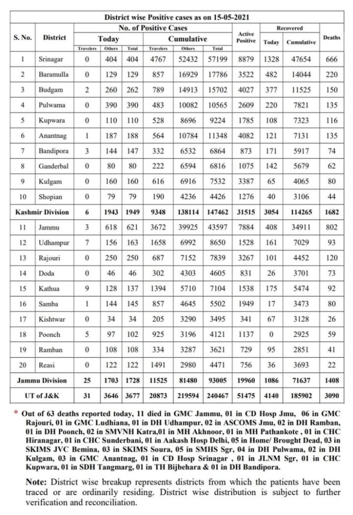Jammu, May 15: 3677 cases of Coronavirus reported in J&K on Saturday along wiyh 63 Deaths.