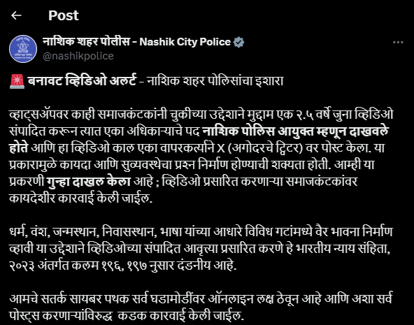 नासिक पुलिस ने आगे कहा, “धर्म, जाति, जन्म स्थान, अधिवास, भाषा के आधार पर विभिन्न समूहों के बीच दुश्मनी पैदा करने के इरादे से वीडियो को प्रसारित करना भारतीय न्याय संहिता, 2023 की धारा 196, 197 के तहत दंडनीय है। हमारी सतर्क साइबर टीम सभी घटनाक्रमों पर ऑनलाइन नजर रख रही है और ऐसे सभी पोस्ट के खिलाफ सख्त कार्रवाई की जाएगी.”