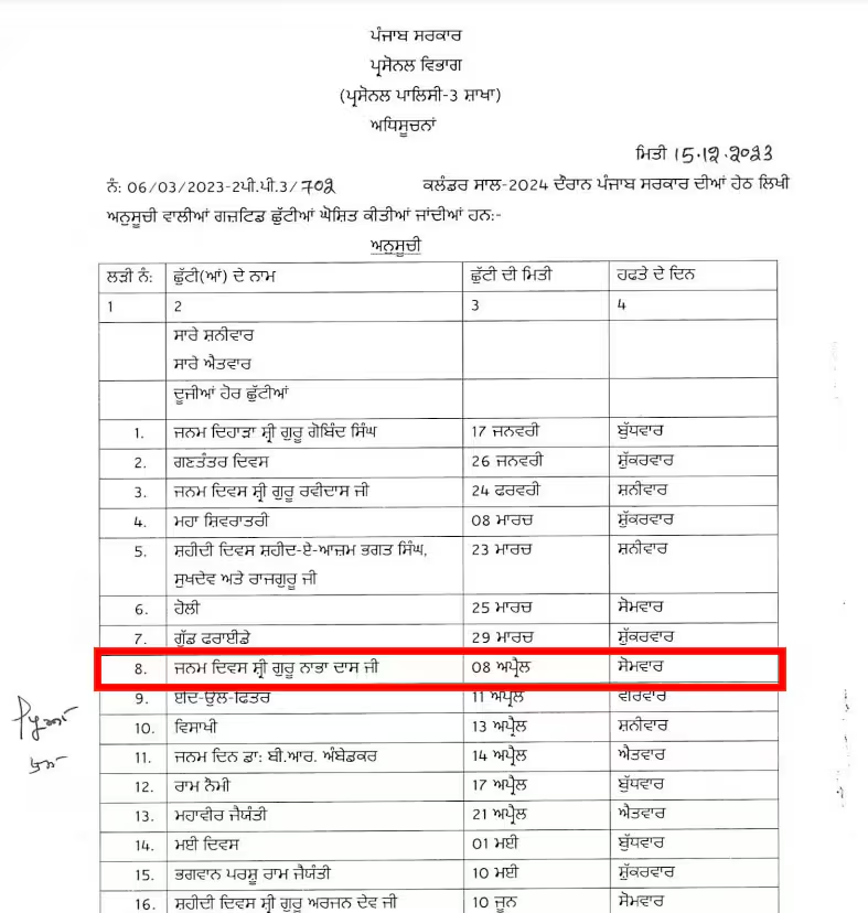 ਜੇਕਰ ਤੁਸੀਂ ਕਿਤੇ ਘੁੱਮਣ-ਫਿਰਣ ਦਾ ਪ੍ਰੋਗਰਾਮ ਬਣਾ ਰਹੇ ਹੋ ਤਾਂ ਤੁਹਾਡੇ ਲਈ ਚੰਗੀ ਖਬਰ ਹੈ। ਸੂਬੇ ਵਿਚ 08 ਅਪ੍ਰੈਲ 2024 ਦਿਨ ਸੋਮਵਾਰ ਨੂੰ ਸਰਕਾਰੀ ਛੁੱਟੀ ਰਹਿਣ ਵਾਲੀ ਹੈ। ਇਸ ਦਿਨ ਸੂਬੇ ਭਰ ਦੇ ਸਕੂਲ, ਕਾਲਜ, ਵਿਦਿਅਕ ਅਦਾਰੇ ਅਤੇ ਹੋਰ ਵਪਾਰਕ ਇਕਾਈਆਂ ਵਿਚ ਛੁੱਟੀ ਰਹੇਗੀ। ਦਰਅਸਲ ਇਸ ਦਿਨ ਸ਼੍ਰੀ ਗੁਰੂ ਨਾਭਾ ਦਾਸ ਜੀ ਦਾ ਜਨਮ ਦਿਵਸ ਸੂਬੇ ਭਰ ਵਿਚ ਮਨਾਇਆ ਜਾਵੇਗਾ। ਸਰਕਾਰ ਨੇ ਸਾਲ 2024 ਦੀ ਸਰਕਾਰੀ ਛੁੱਟੀਆਂ ਦੀ ਸੂਚੀ ਵਿਚ ਇਸ ਦਿਵਸ ਨੂੰ ਥਾਂ ਦਿੱਤੀ ਹੈ।