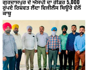 ਸੂਬੇ ਵਿੱਚ ਭ੍ਰਿਸ਼ਟਾਚਾਰ ਵਿਰੁੱਧ ਜਾਰੀ ਆਪਣੀ ਮੁਹਿੰਮ ਦੌਰਾਨ ਮੰਗਲਵਾਰ ਨੂੰ ਐਸ.ਪੀ. ਹੈੱਡਕੁਆਰਟਰ, ਗੁਰਦਾਸਪੁਰ ਦੇ ਰੀਡਰ ਵਜੋਂ ਤਾਇਨਾਤ ਗੁਰਪ੍ਰਤਾਪ ਸਿੰਘ, ਸਬ ਇੰਸਪੈਕਟਰ (ਸਥਾਨਕ ਰੈਂਕ) ਨੂੰ ਉਹ 5,000 ਰੁਪਏ ਦੀ ਰਿਸ਼ਵਤ ਲੈਂਦਿਆਂ ਰੰਗੇ ਹੱਥੀਂ ਕਾਬੂ ਕੀਤਾ ਹੈ।